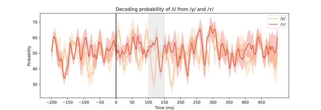 Bilingual Perception of New Sound Segments: This project investigates the neural decoding of novel speech sounds. We ask how the larger language background of bilinguals facilitates or inhibits the perception and decoding of novel speech sounds in comparison to monolingual individuals. Initial results indicate that the specific rates of success for perceiving certain new sounds over others are guided by the listener’s specific language background, reflect the acoustic similarity between the new sounds and known sounds, and condition the neural response to new sounds over time. (Data collection on this project was halted due to the Covid-19 pandemic–stay tuned for more!)