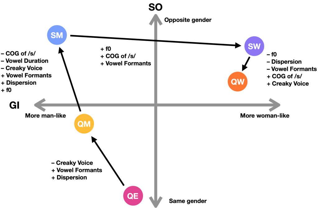 Sociophonetics of Gender and Sexuality: A long-standing question in speech perception and sociolinguistics asks how elements of a speaker’s identity are perceived from the acoustic signal. I assembled a small corpus of excerpts from podcasts and asked how a listener reconstructs a speaker’s gender identity, sexual orientation, and gender expression from speech. I’m interested in the acoustic features that predict listener ratings and perception of a speaker’s gender identity, sexual orientation, and gender expression. A figure showing listener’s perceptual-acoustic space is shown below. The full project can be found here.