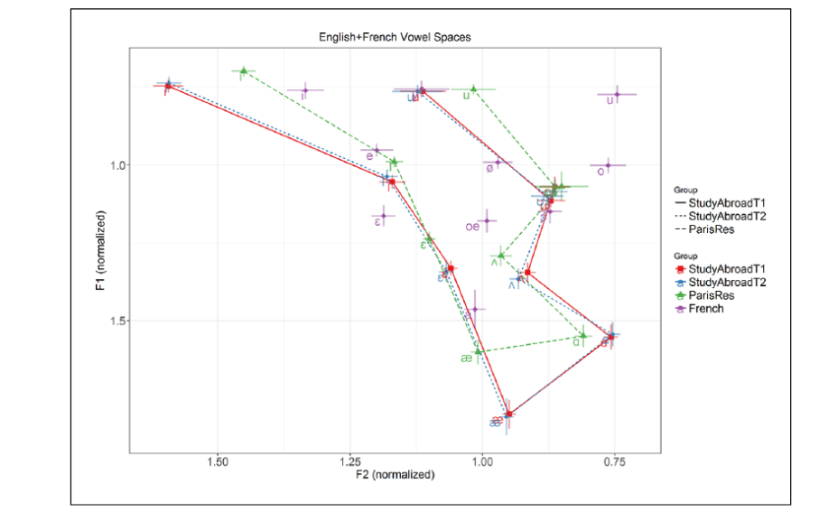 Phonetic Drift: This study looks at the interaction between a speaker’s first language (L1) and second language (L2) vowel spaces during immediate and long-term immersion in the L2 environment. We found that L1 vowel productions shift towards ambient L2 vowel categories due to the length of exposure in the L2 immersion environment.
